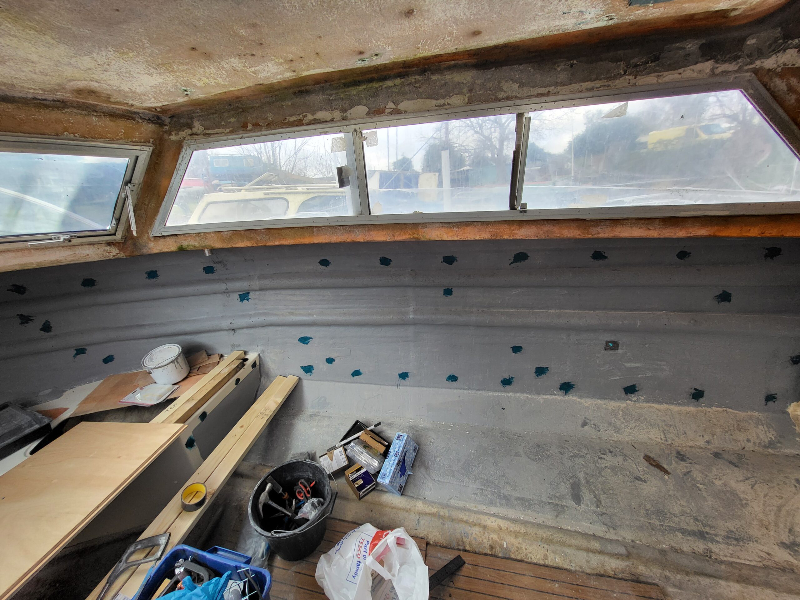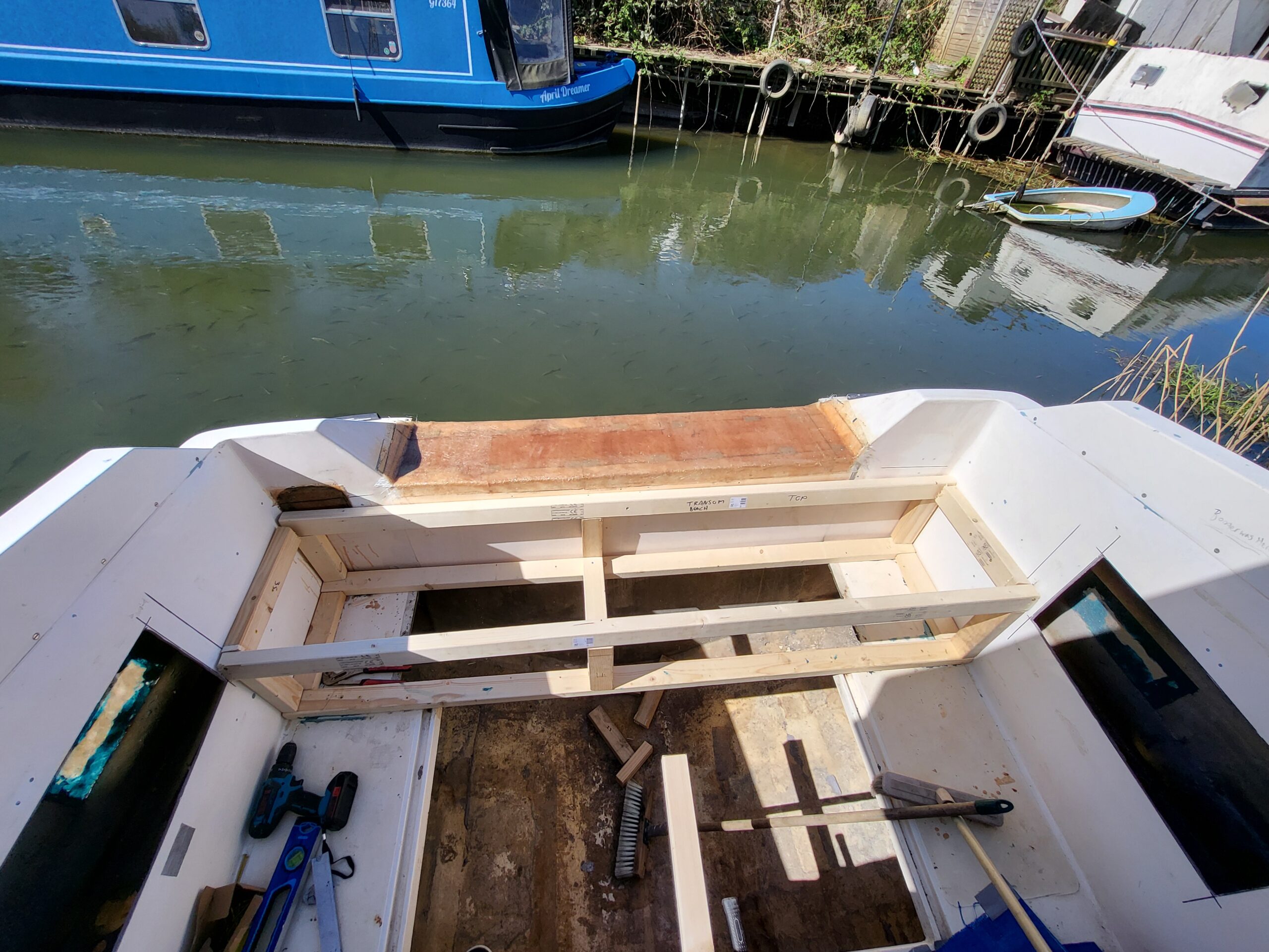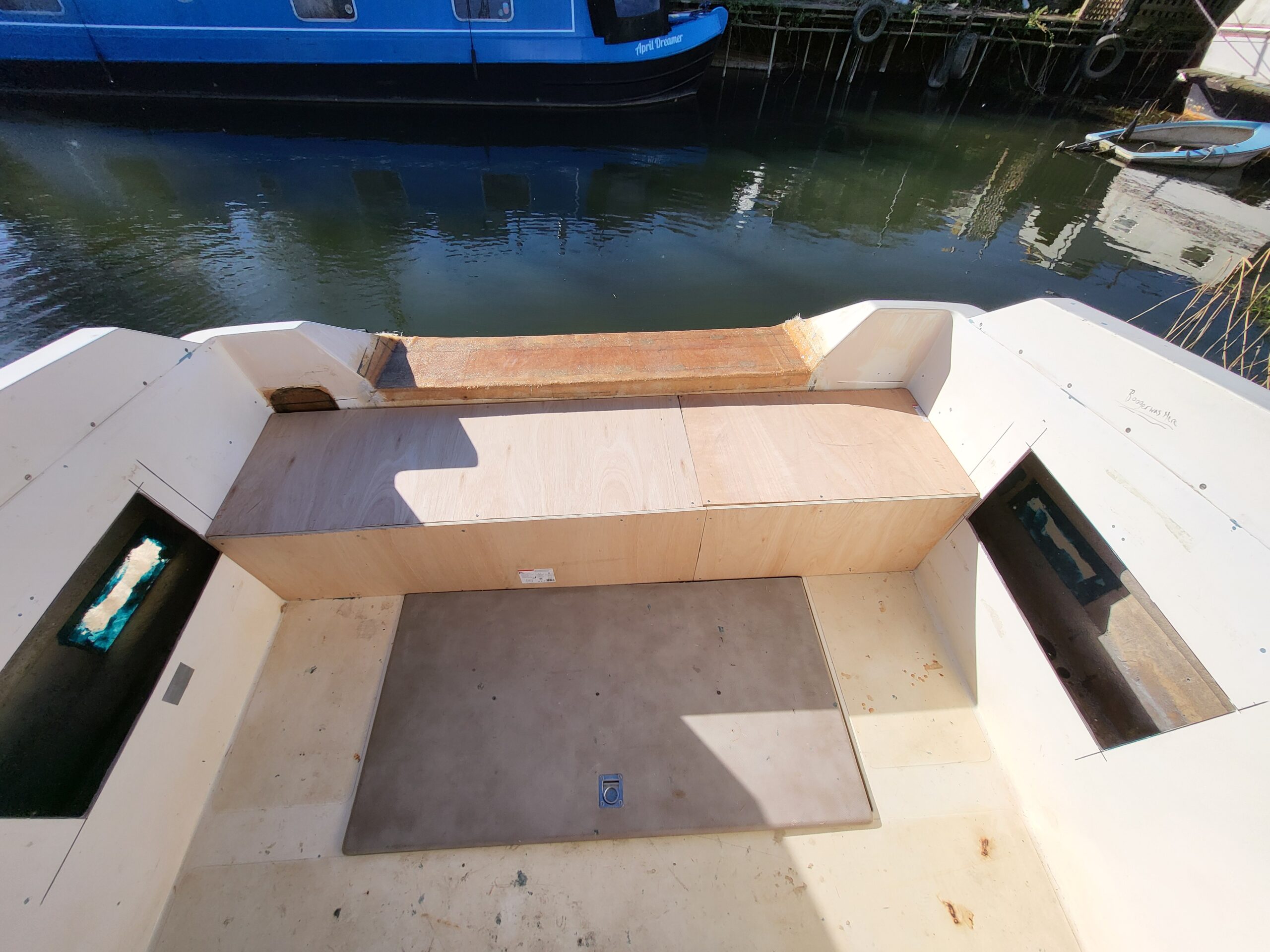 After successfully managing to fibreglass the transom I went about building the bench across the engine bay extension. It went well, eventually. The usual fuckwittery of cutting things too short etc was ever present.