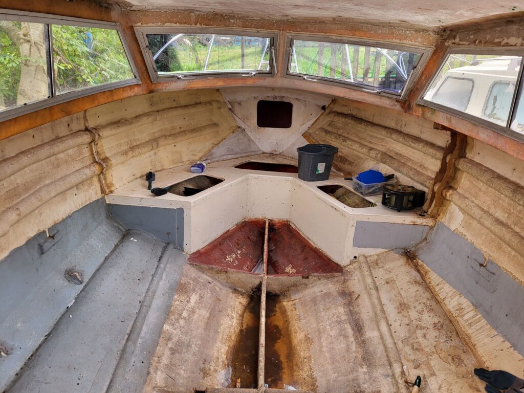 - Removed all the wood from inside the cabin – Most if not all of the wood inside the cabin needed to be removed as it had been neglected and damaged. This included the loose wooden floorboards covering the bilge area, The toilet/bathroom wall, the supporting beams for the floorboards. The thin boards of plywood that separated the sleeping berths from the rest of the cabin, a cabinet, the toilet and few other bits and pieces.