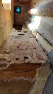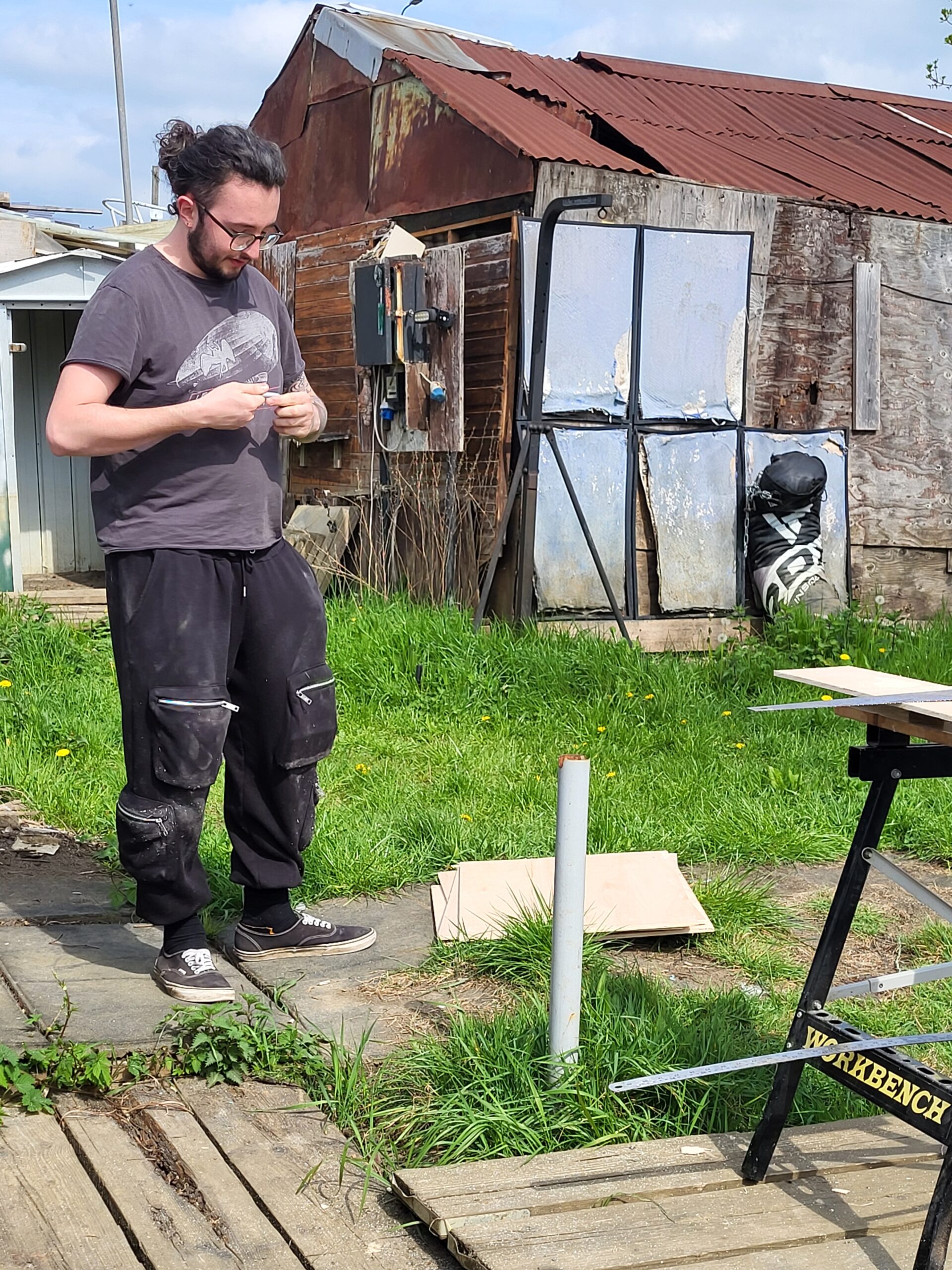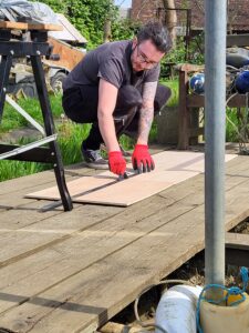 Junior, the hair bun freak came down to give a hand on the boat today. The project of the day was to sort the insides of the side lockers out. Which is what we did. They were in a right fucking state, so we cut some ply wood to size and slid them over the old side locker shelves. They will eventually get glassed in and painted. Since this has been done, the side lockers have come in very handy to store keys and phones etc. whilst working.