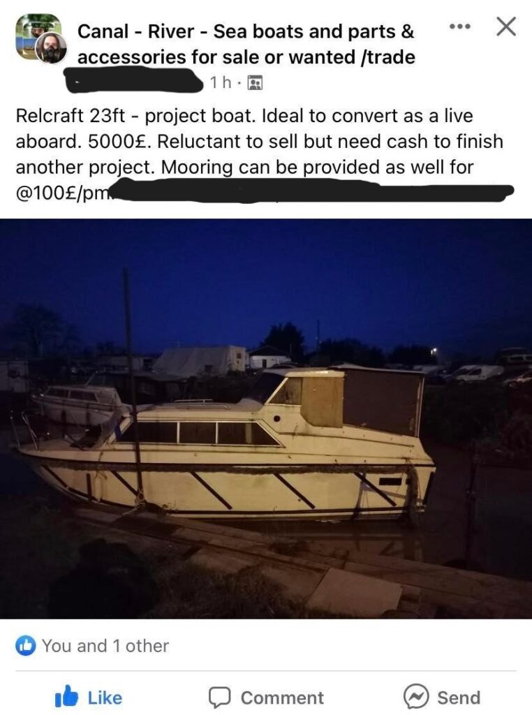 In an earlier search I managed to find an advert for the boat by the previous owner, where he listed it for £5000 (I’m still convinced that was a typo), and its location was listed at the very boat yard it’s at now. I’ve reached out to him via Facebook, but as yet, no reply. It may very well be that he’s checked my profile out and found himself on these very hallowed pages, and who can blame him if he wants nothing to do with me?