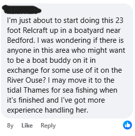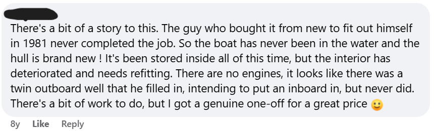 Read a bit further on though, the boat has never been in water up until this point. What the hell? Why own a boat if you’re not going to put it in water? Bear in mind the boat was built in the late 70s, early 80s and it was being sold in 2019 without ever having been on water? Hmmm, perhaps farmer Brown mistook it for a new fangled combine harverster? Who knows. But dead end for me.