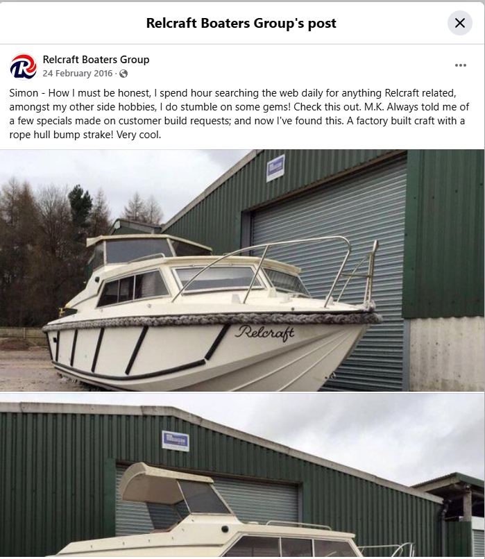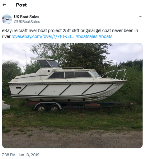 Anyway, once I’d signed up I went about doing a generic search for “Relcraft”. Guess what? Yup, that stripey motherfucker turned up in the results! So it looks like the boat was for sale back in June of 2019! It still looks as though it’s on a farm here, and sans snail parts. I tried clicking on the link in the post but it threw an “Item not found” error on eBay. I tried finding a way to find the original listing on there but to no avail. They must purge their archives after a certain number of years. It has been 5 years since it was posted.