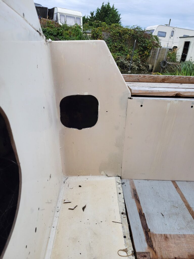 - Shape the “Glory Hole” into a regular shape – I’ve had to do this so when I get round to patching the hole it’ll be easier to patch. This is where some will have a heart attack, Beasty with a cutting tool on a boat. That didn’t end well last time.
