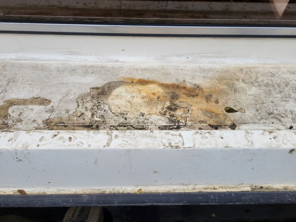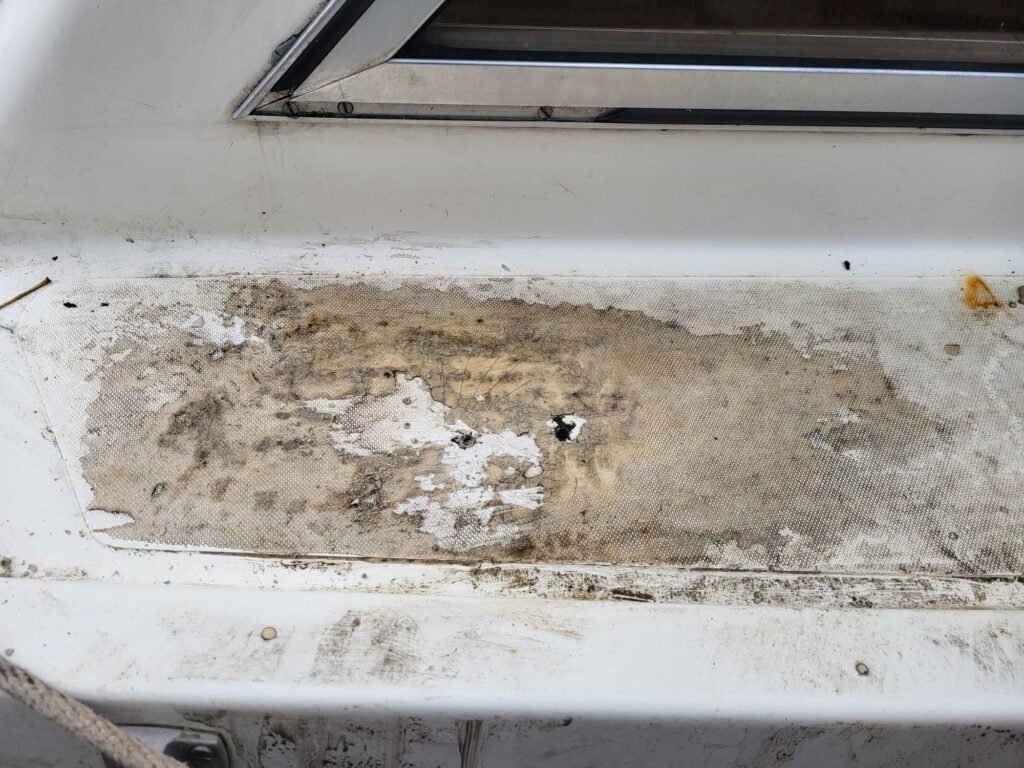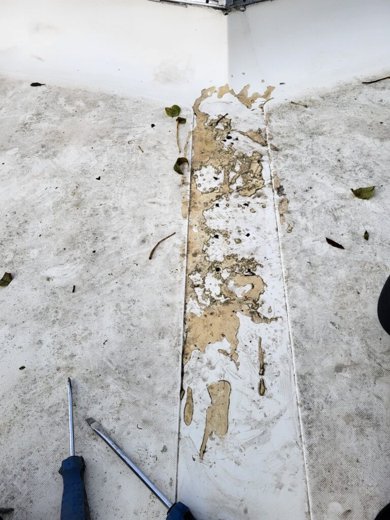 Port side cabin walk-way needed a bit of TLC too. These are the two known sources of water leakage into the cabin. Previous owner has done the same thing here, removed something and filled the screw/bolt holes with rubber and then poured resin over the area.