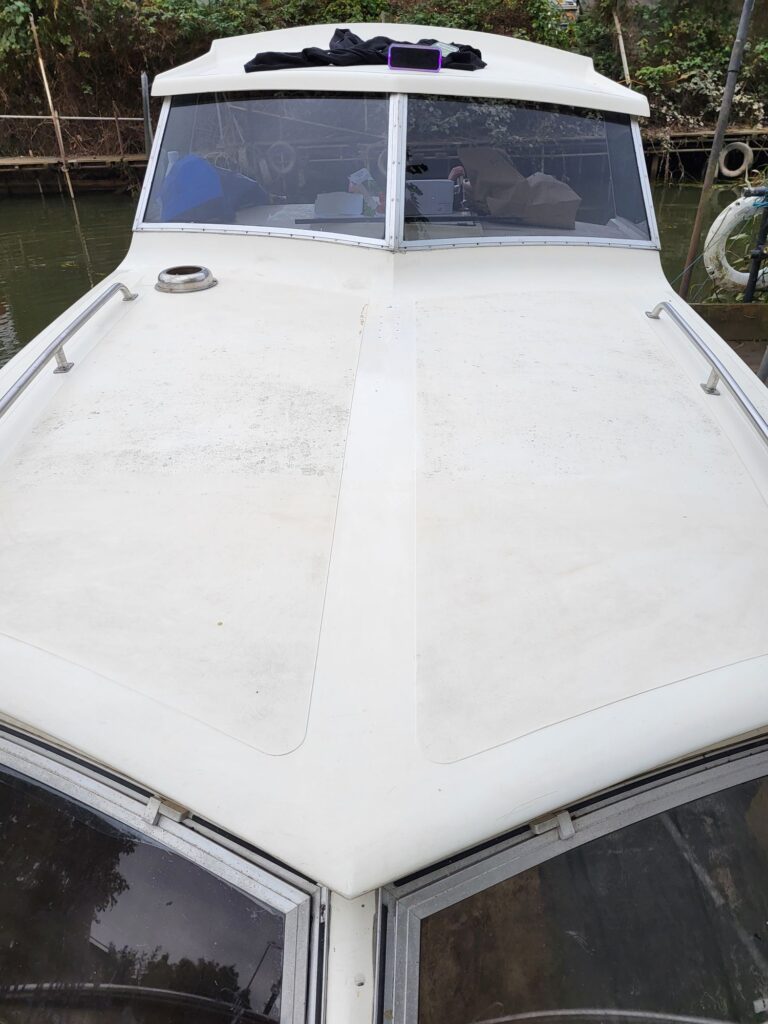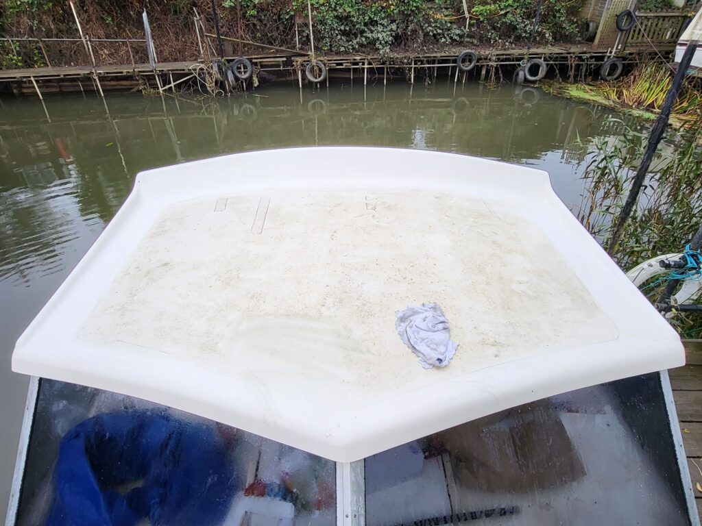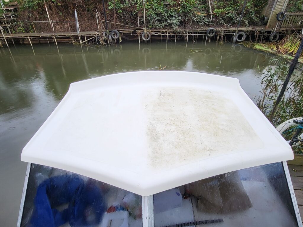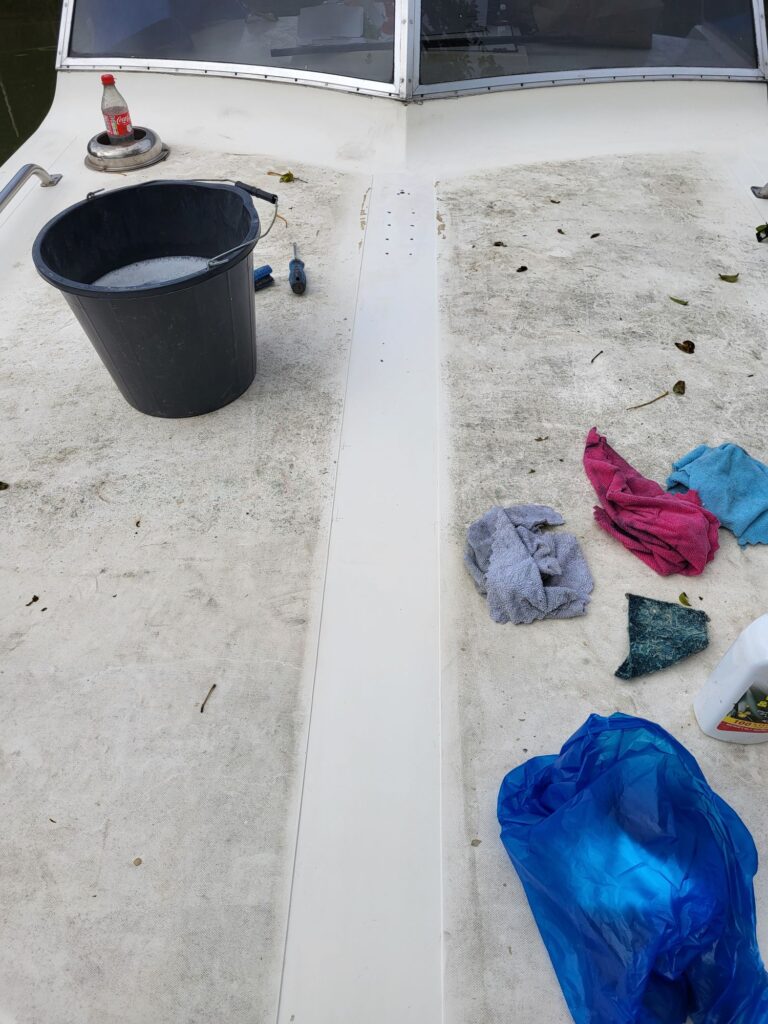 We then started on the cabin roof and this involved more than just elbow grease. One of the previous owners seems to have taken off a piece of metal work, filled the screw/bolt holes with some sort of rubber sealant and then poured resin over the holes. I had to deal with that first. Whilst doing this, I realised I’d probably found a third source of water leakage into the cabin.